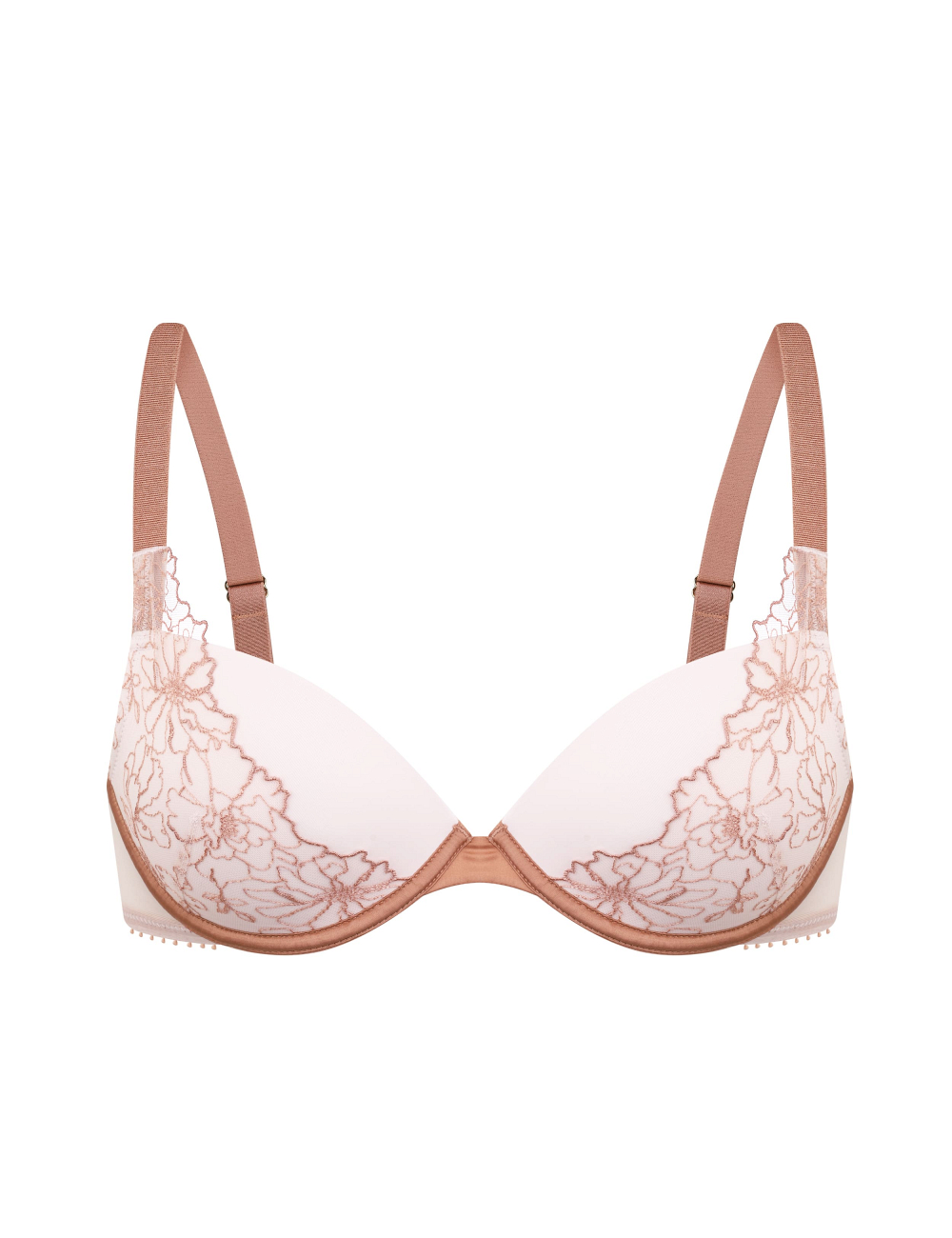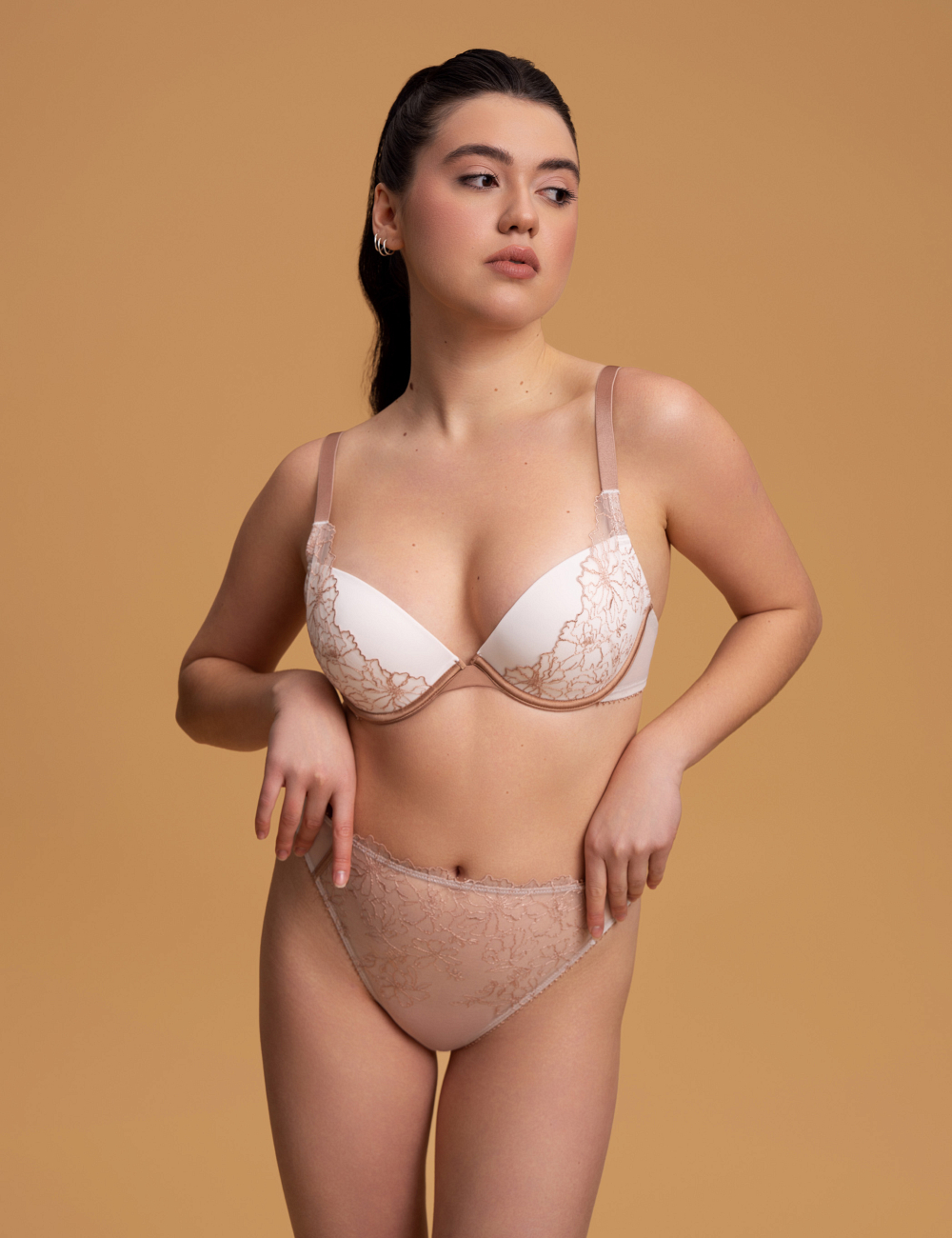 • Biustonosz z formowaną miseczką i odpinanym push-upem nadaje wizualnej objętości i centruje biust;