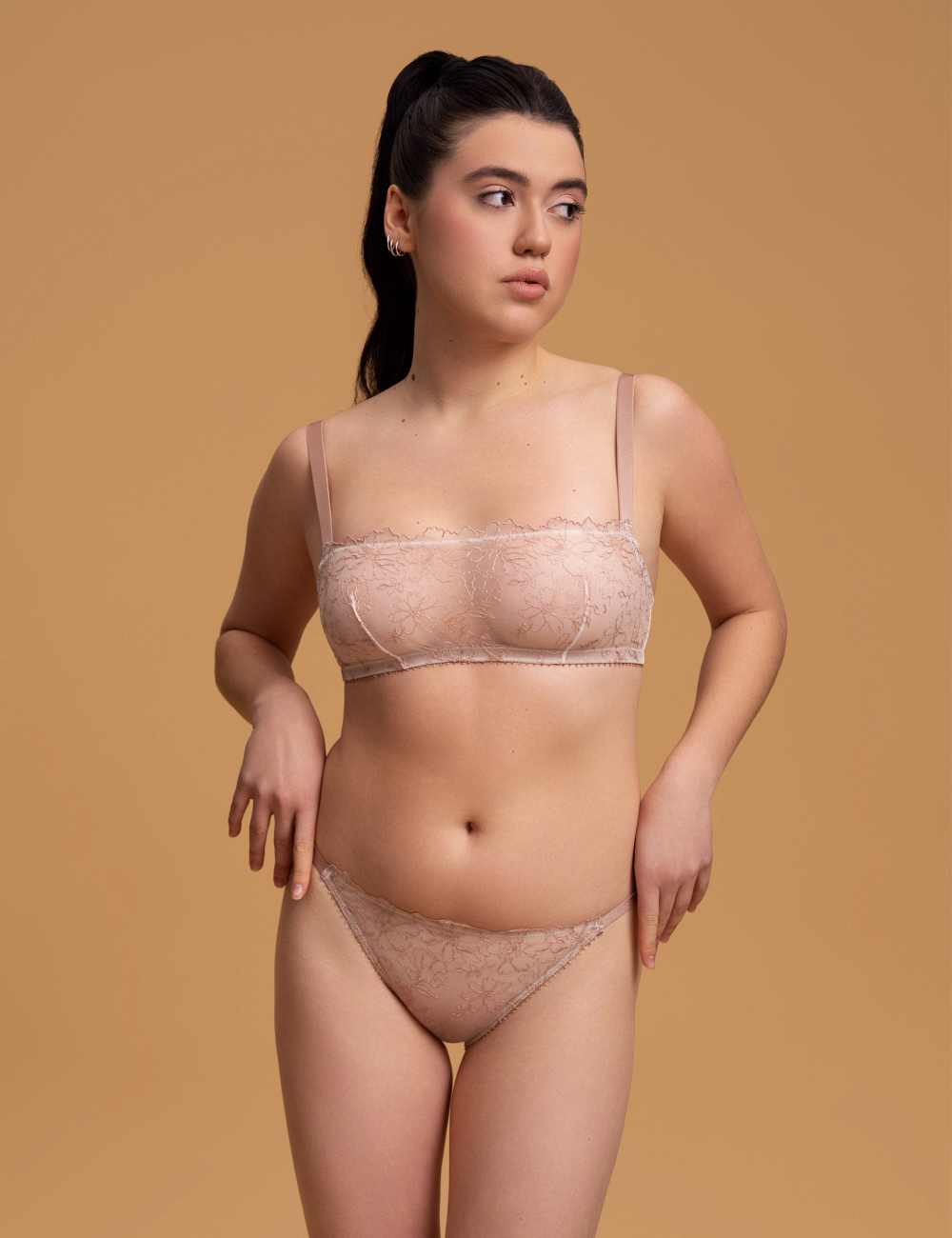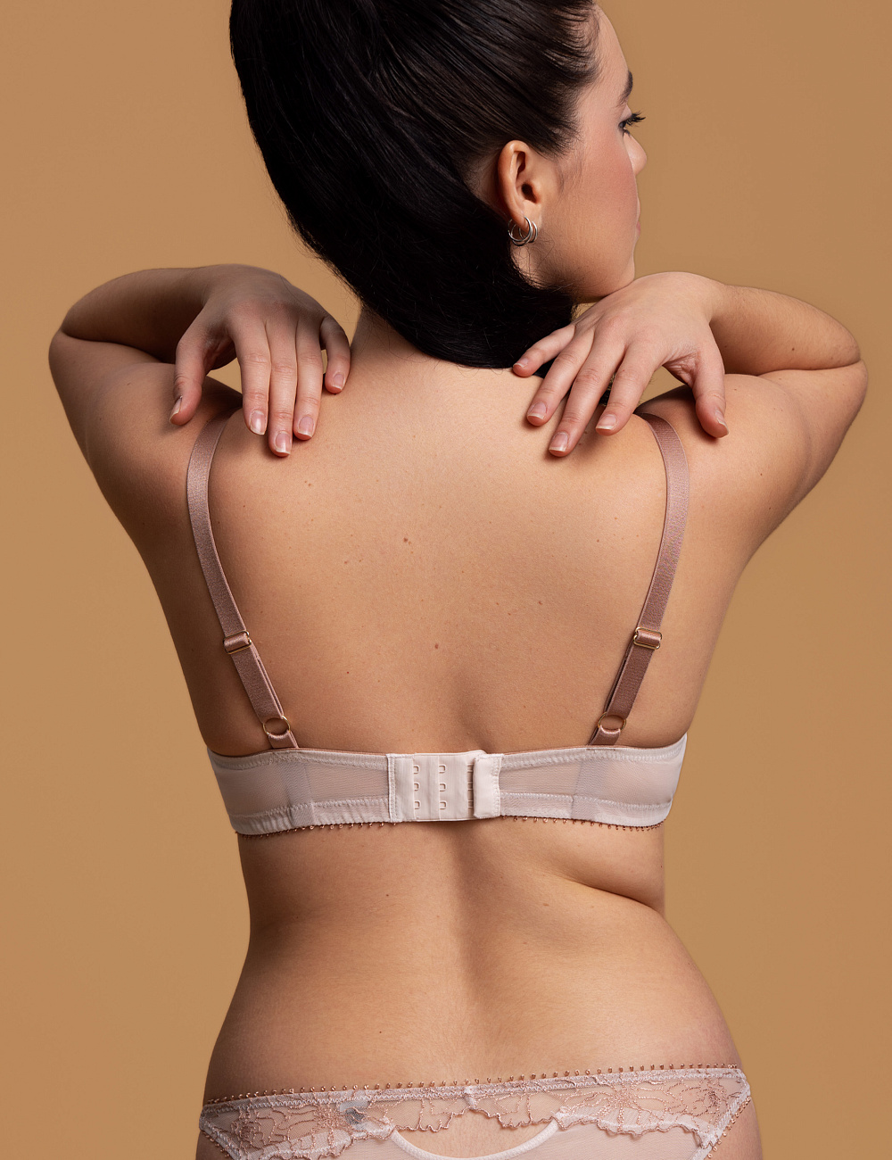 • Miseczka wykonana jest z jednej warstwy nieelastycznej siateczkowej tkaniny z haftem – zachowuje kształt, nie rozciąga się i zapewnia podtrzymanie biustu;