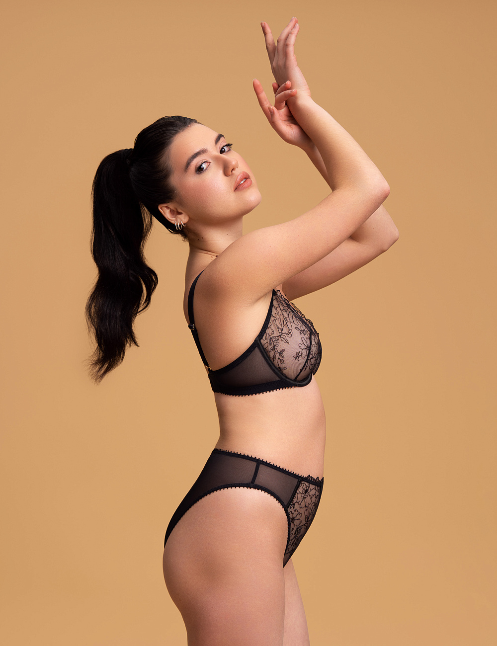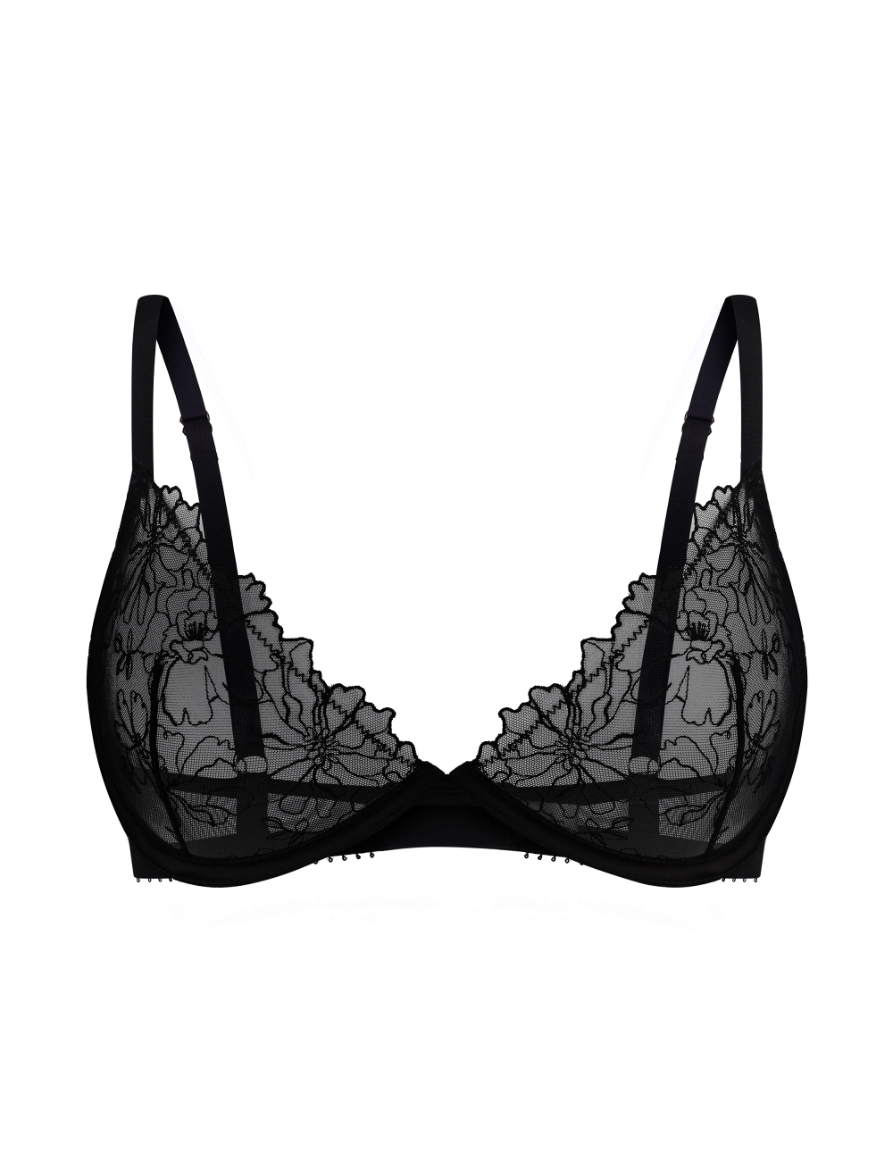 • Miseczka wykonana jest z jednej warstwy nieelastycznej siateczkowej tkaniny z haftem – zachowuje kształt, nie rozciąga się i zapewnia stabilne podtrzymanie biustu;