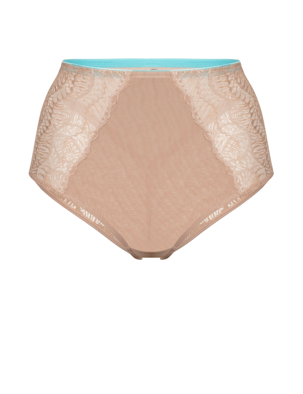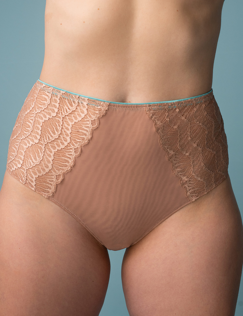 • Majtki z wysokim stanem wykonane z elastycznej koronki i siateczkowej tkaniny;