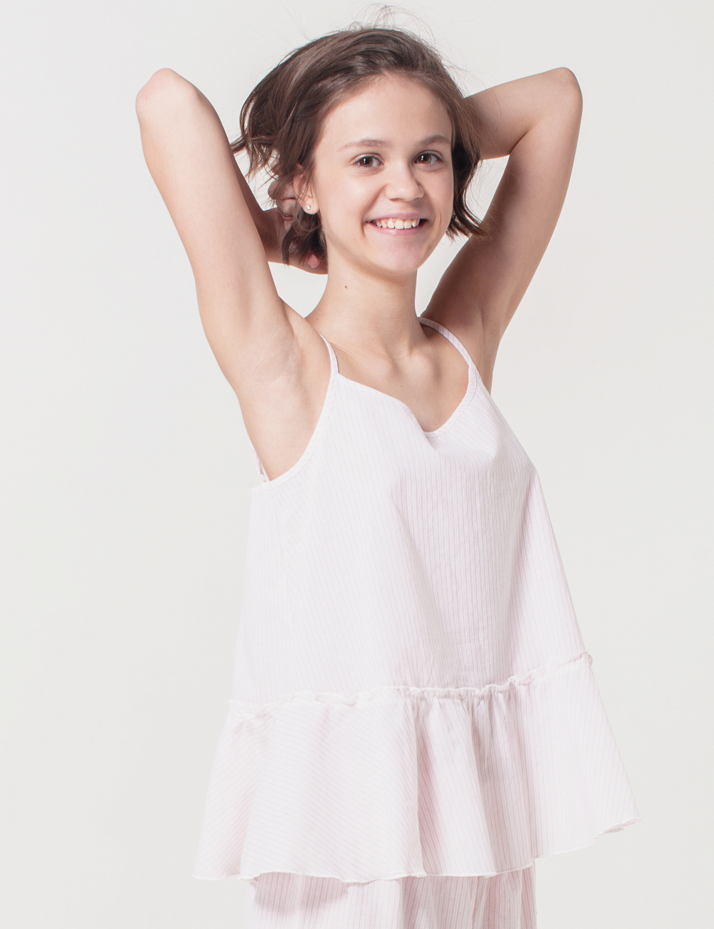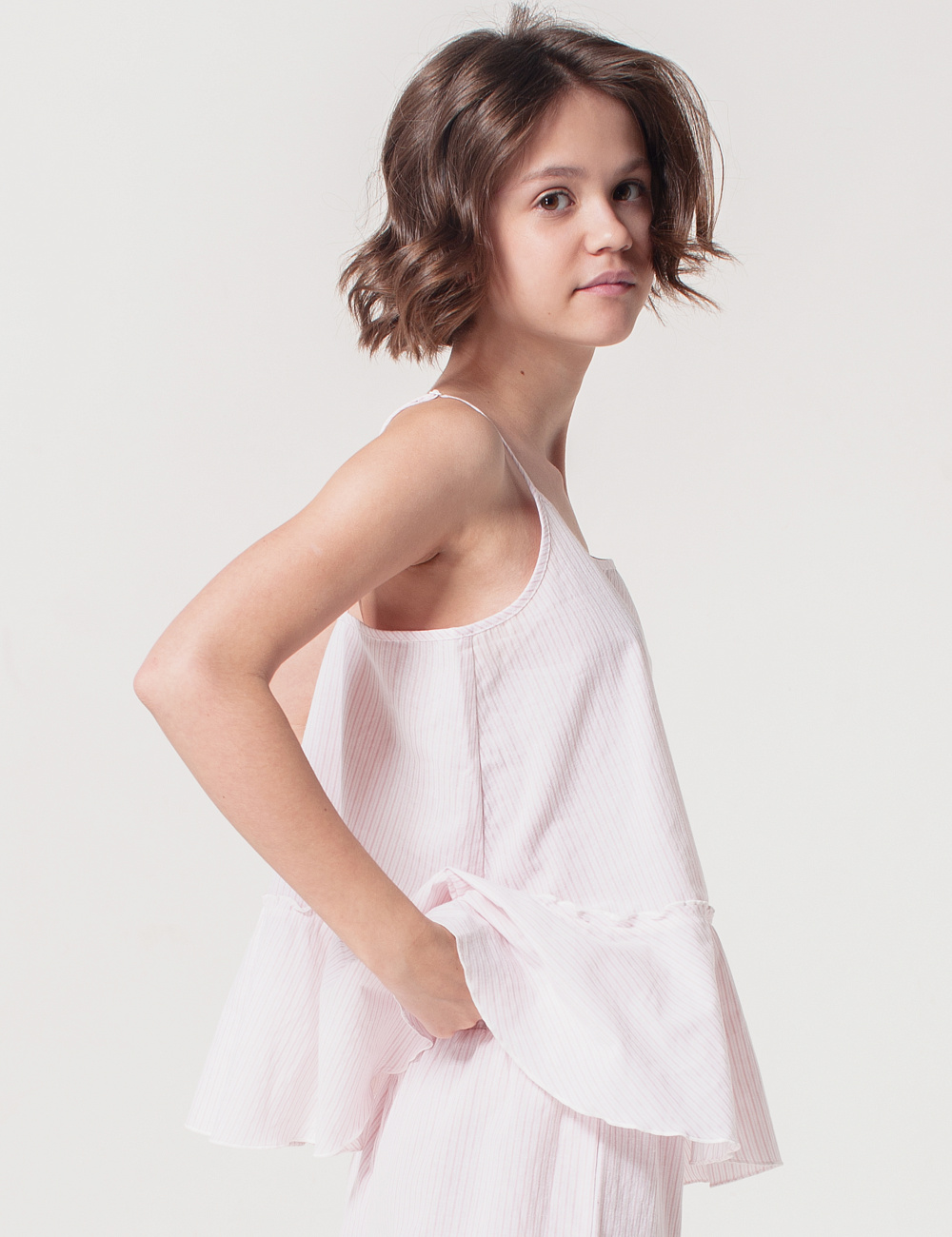 • Top jest lekko poszerzony do dołu i posiada ozdobne szerokie falbany, które dodają delikatności obrazowi.